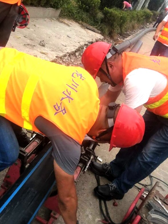 2018年9月6日上午,江都區武堅鎮開發區DN200PE管道施工現場打破了往日的沉悶,一輛輛工程施工車輛整齊地停放在道路一側,揚州市惠民區域供水投資有限公司各鄉鎮供水所和測漏維修隊將在這里進行PE管熔焊技術實踐演練活動。