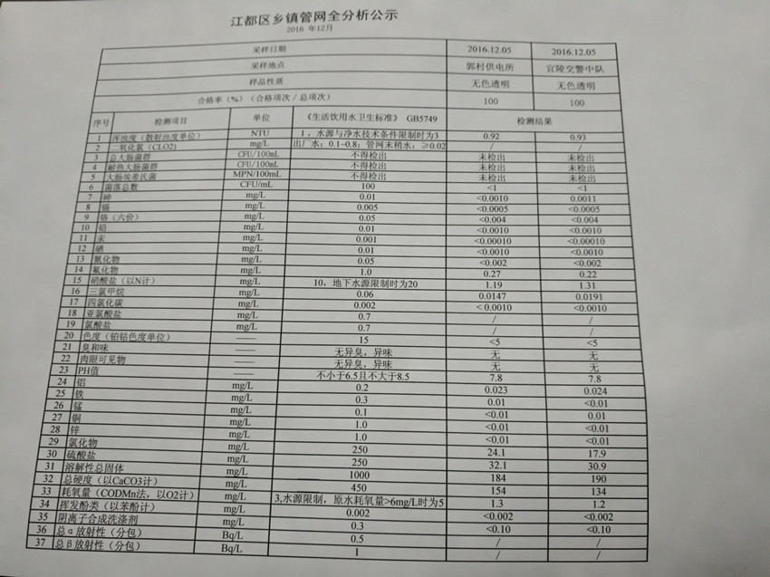 2016年12月江都區(qū)鄉(xiāng)鎮(zhèn)管網(wǎng)全分析公示