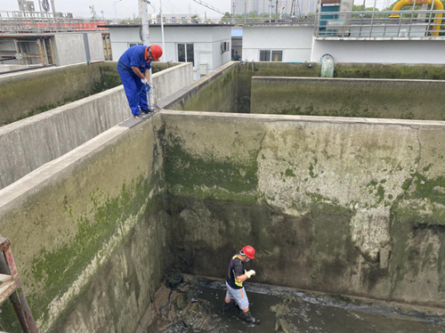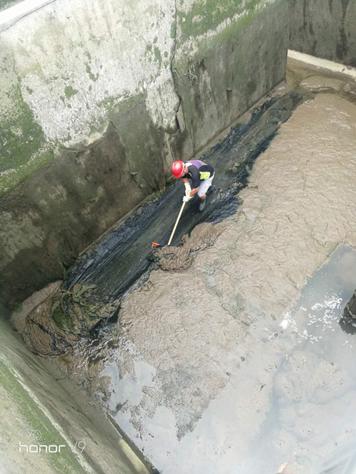 正值梅雨季節(jié),污水廠池組內(nèi)綠藻、青苔滋生,且受連續(xù)多日暴雨影響,導致后道污泥積淤嚴重,影響水質(zhì)處理效果,為防止池內(nèi)淤泥沉積過多影響池組的正常運轉(zhuǎn),7月8日,我公司運營管理辦公室會同設(shè)備管理辦公室,共同研究決定對邵伯油田污水廠開展池組應急清淤工作,公司領(lǐng)導高度重視此次清淤工作,方案確定后,我單位立即展開相關(guān)工作,聯(lián)合第三方維保單位,在保證生產(chǎn)的前提下,明確分工,并對相關(guān)施工安全環(huán)節(jié)進行嚴密部署,以確保此次清淤工作安全高效完成。