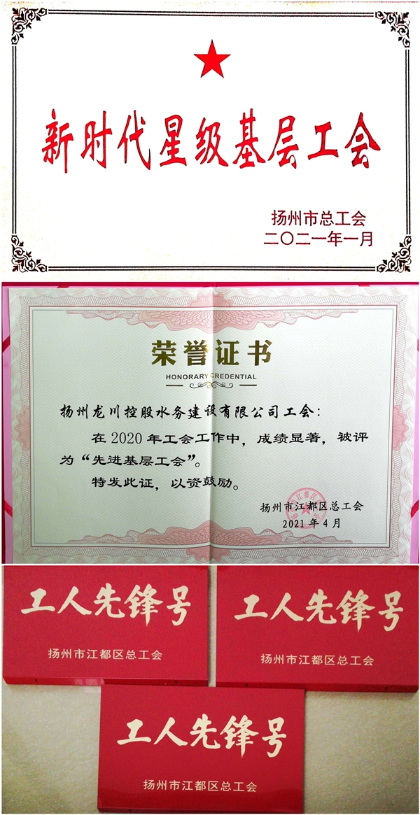 在一年一度的“五一國際勞動節”即將來臨之際,江都區總工會第十五屆三次全委(擴大)會議在城區召開,大會在總結上年度以來工會各項工作的同時,并對涌現出的各類先進集體和先進個人進行了隆重表彰。揚州龍川水務公司工會榮獲揚州市級“新時代星級基層工會”和江都區級“先進基層工會”稱號;龍川水務公司下屬環境檢測公司中心化驗室、下屬惠民區域供水公司營銷管理辦公室和龍川水務公司客戶服務部客服大廳三個班組榮獲“工人先鋒號”先進集體稱號。