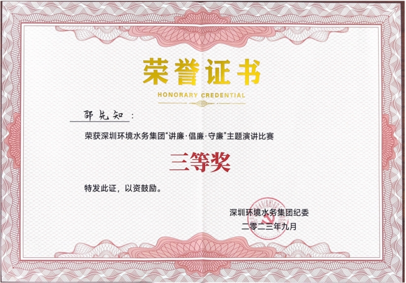 龍川水務公司參賽選手在環水集團“講廉、倡廉、守廉”主題演講比賽中榮獲三等獎