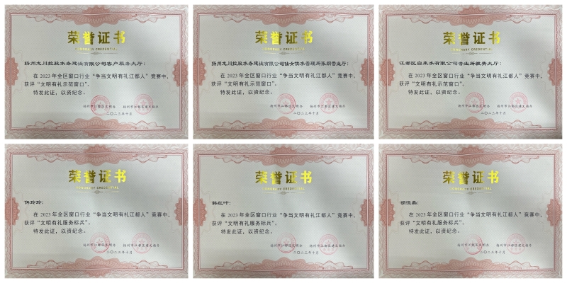 近日,揚(yáng)州龍川水務(wù)榮獲多項榮譽(yù)表彰——揚(yáng)州市江都區(qū)文明辦、揚(yáng)州市江都區(qū)建設(shè)全國文明城市指揮部辦公室聯(lián)合授予揚(yáng)州龍川水務(wù)客戶服務(wù)部客服大廳、下屬自來水公司營業(yè)所繳費(fèi)大廳、下屬惠民公司仙女供水管理所張綱營業(yè)廳“文明有禮示范窗口”榮譽(yù)及公司員工佴玲玲、韓紅葉、胡恒晶“文明有禮服務(wù)標(biāo)兵”稱號。