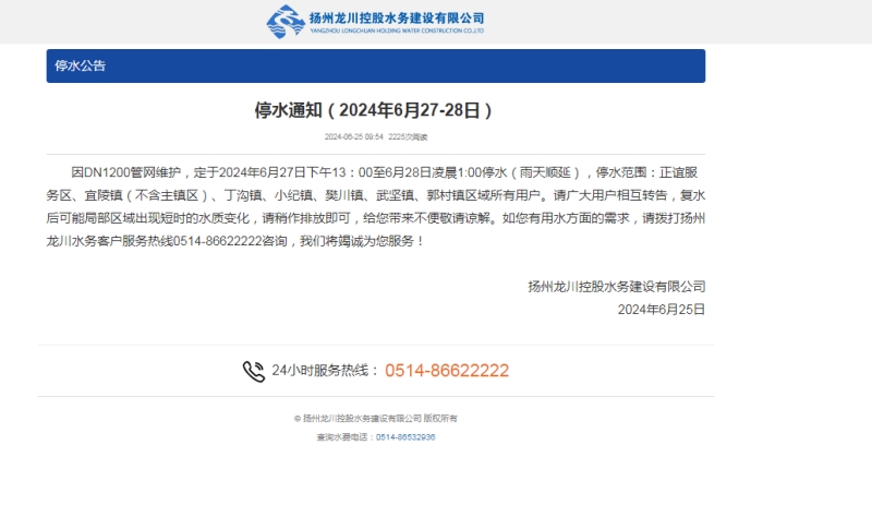 揚州龍泉建設工程有限公司在通過現場實際查勘的基礎上,成立了專項施工隊伍,編制專項施工方案。與建設單位管網辦及揚州長江水務有限公司主管部門積極對接,了解管道施工碰接上下游主管道控制閥門,中途排污閥門及壓力表設備裝置,通過召開停水施工會議,確定了具體停水施工日期,由建設單位管網辦于會議48小時后在網上發布停水通知。