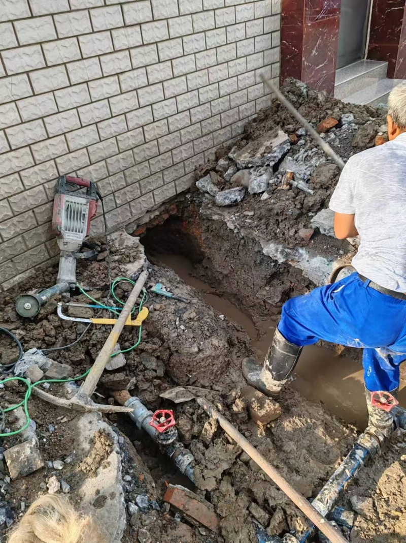 近期玉帶公寓用戶反映21幢、22幢高層無水可用,接到用戶報修后,自來水公司管網(wǎng)辦副主任王曉靜同志與龍泉建設(shè)工程公司維修部主任李兆軍同志帶領(lǐng)維修人員,第一時間趕到現(xiàn)場,為居民解決用水問題,經(jīng)現(xiàn)場查勘發(fā)現(xiàn):玉帶公寓(前身為公檢法大院)內(nèi)部供水管道多年前安裝,自來水管道布局較為復(fù)雜,漏點又在房屋內(nèi)部,維修難度較大。維修人員利用尋管儀巡查,在巡查過程中因干擾太多無法確定漏點上游管道,后經(jīng)管網(wǎng)辦與龍泉公司工作人員現(xiàn)場拿方案,最終決定采取在墻體外側(cè)開挖,切除管道的辦法對漏點進行維修。