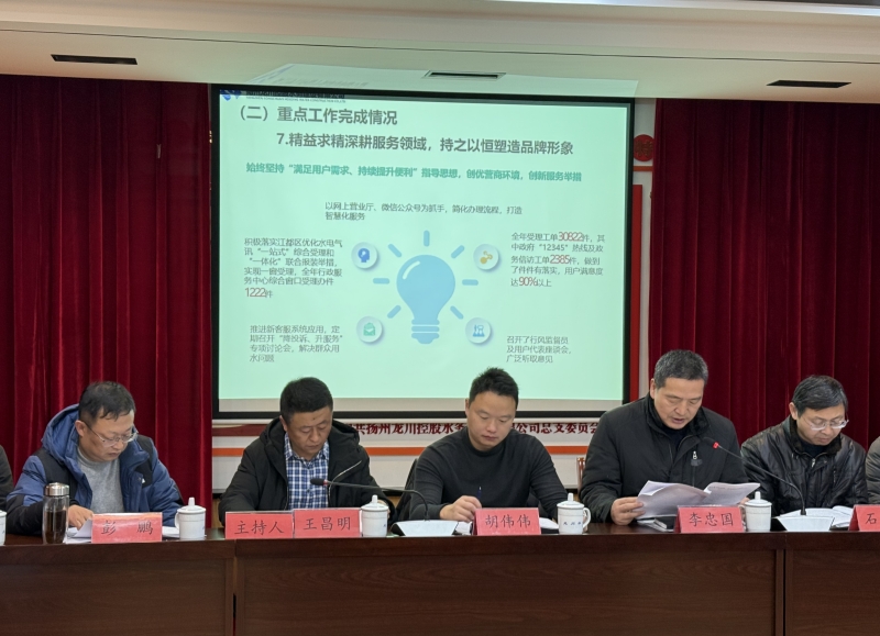 最后是本次大會的領(lǐng)導講話環(huán)節(jié),龍川控股集團副總兼水務公司董事長胡偉偉同志作重要講話,在向2024年度所獲先進集體和個人表示祝賀和充分肯定水務公司過去一年所取得的成績的同時,主要就如何開展好2025年工作提出了三個方面的具體要求:一是要保持“跳起來摘桃子”的拼勁。要把思想的發(fā)條擰得更緊、工作舉措謀劃得更實。二是要保持“挺直身敢擔當”的闖勁。不斷增強企業(yè)實力、強健發(fā)展后勁,推動水務公司跨越式新發(fā)展。三是要保持“沉下心抓落實”的韌勁。緊盯年度目標,聚焦工作重點、難點,聚力供排水安全穩(wěn)定、提升對外服務滿意度,確保高質(zhì)量完成年度任務。同時號召全體水務員工以更加寬廣的視野、更加有力的行動,干在實處,走在前列,同心協(xié)作,聚力攻堅,為實現(xiàn)水務公司的新跨越、新發(fā)展做出更大的貢獻!