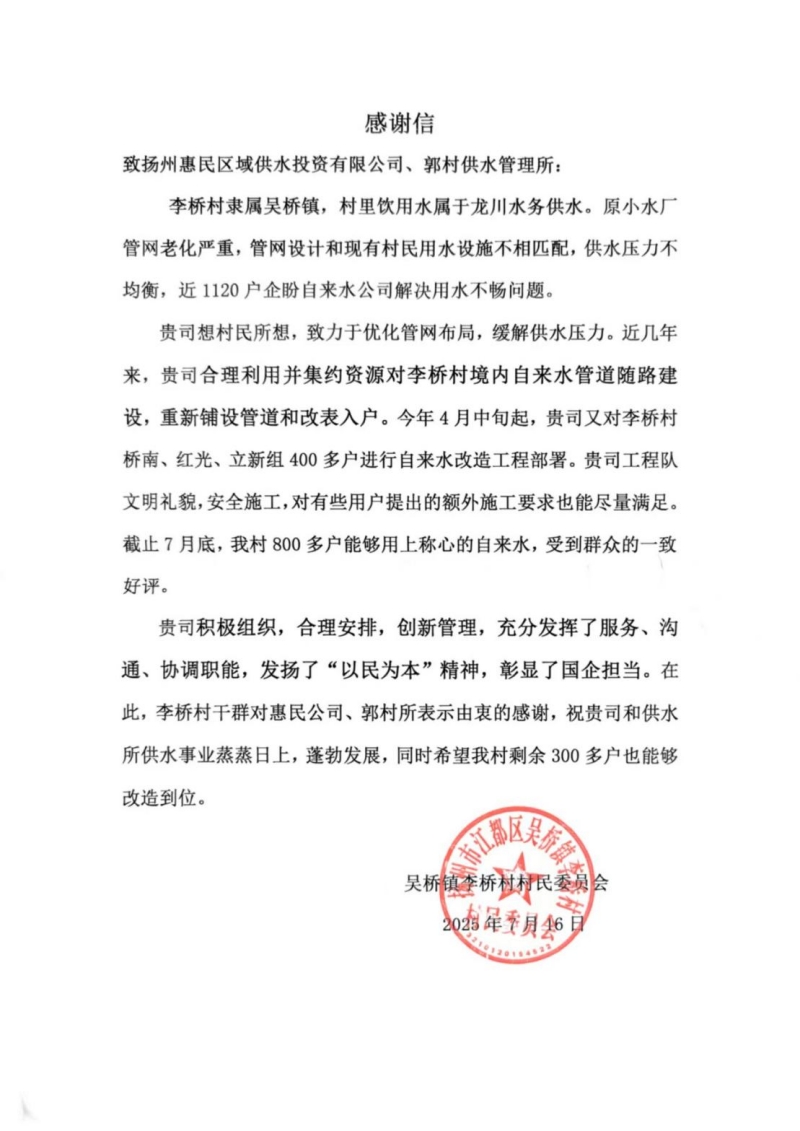 捧著這封沉甸甸的感謝信,惠民區(qū)域供水公司負(fù)責(zé)人蔣珀表示,收到這封感謝信既是肯定也是鞭策。目前李橋村自來水改造項(xiàng)目還在實(shí)施中,預(yù)計(jì)今年10月底竣工,改造工程完工后,李橋村的自來水供水能力和水質(zhì)將得到顯著提升,能夠徹底解決村民的用水“煩心事”,村民的認(rèn)可就是我們工作的最大動(dòng)力,保障群眾用上“放心水、滿意水”是我們的職責(zé)所在。今后,惠民區(qū)域供水公司將繼續(xù)聚焦群眾用水需求,不斷提升供水服務(wù)質(zhì)量,讓更多群眾享受到更為優(yōu)質(zhì)、便捷的供水服務(wù),讓更多村組享受到優(yōu)質(zhì)的供水服務(wù),把民生工程做到群眾心坎上。用實(shí)際行動(dòng)踐行“為民辦實(shí)事”的承諾。