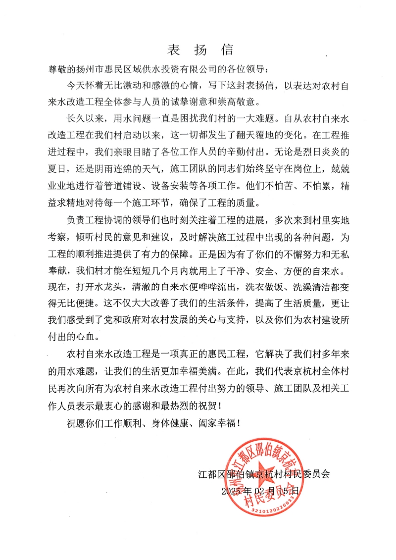 “長久以來,用水問題一直是困擾我們村的一大難題。自從農村自來水改造工程在我們村啟動以來,這一切都發生了翻天覆地的變化”;“負責工程協調的領導們也時刻關注著工程的進展,多次來到村里實地考察,傾聽村民的意見和建議,及時解決施工過程中出現的各種問題,為工程的順利推進提供了有力的保障”;“在工程推進過程中,我們親眼目睹了各位工作人員的辛勤付出。無論是烈日炎炎的夏日,還是陰雨連綿的天氣,施工團隊的同志們始終堅守在崗位上,兢兢業業地進行著管道鋪設、設備安裝等各項工作。”以上內容是一封來自江都區邵伯鎮京杭村村民委員會送給邵伯供水管理所的《表揚信》,信中不僅飽含用戶對于自來水條件改善的感謝之情,同時還是對公司工作的肯定,表揚信中提及到公司為改善京杭村用水所做出的努力,其中既有北片維修所和邵伯供水所團隊不辭辛勞現場來回的協調解決矛盾的身影,又有施工人員克服惡劣施工環境力爭保質保量完成工程改造辛勤的的付出,正是這樣的一封表揚信讓身為水務人感到自豪與驕傲,用戶的滿意才是對我們工作最大的肯定。