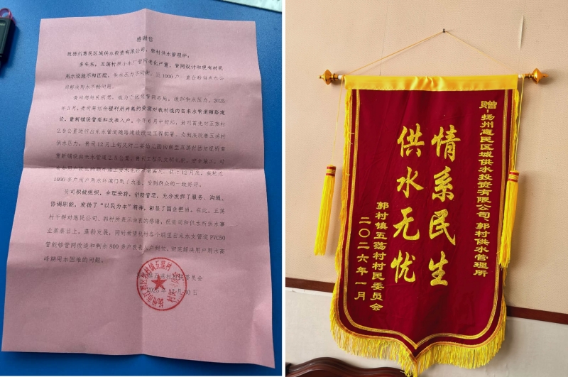 近日,揚(yáng)州市江都區(qū)郭村鎮(zhèn)五蕩村村民委員會(huì)將一面印有“情系民生,供水無憂”的錦旗和一封飽含深情的感謝信,送到揚(yáng)州市惠民區(qū)域供水投資有限公司郭村供水管理所,以最質(zhì)樸的方式,向全力破